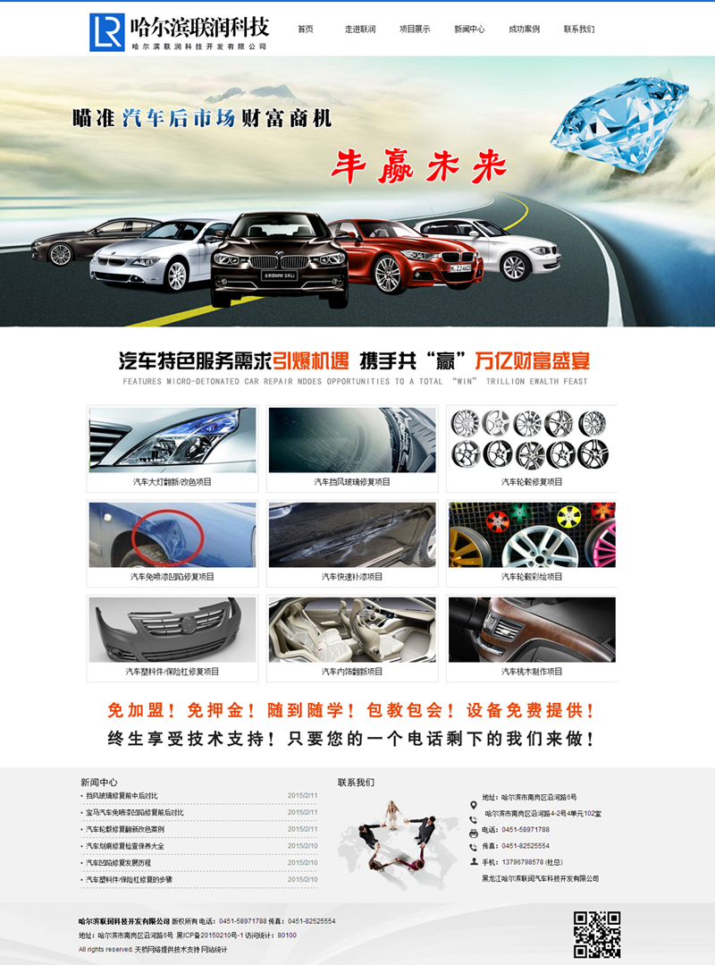 哈爾濱聯(lián)潤科技開發(fā)有限公司,是一家以:汽車大燈翻新/改色項(xiàng)目、汽車擋風(fēng)玻璃修復(fù)項(xiàng)目、汽車輪轂修復(fù)項(xiàng)目、汽車免噴漆凹陷修復(fù)項(xiàng)目、汽車快速補(bǔ)漆項(xiàng)目、汽車輪轂彩繪項(xiàng)目、汽車塑料件/保險(xiǎn)杠修復(fù)項(xiàng)目、汽車內(nèi)飾翻新項(xiàng)目、汽車桃木制作項(xiàng)目為主的高科技汽車科研開發(fā)公司。